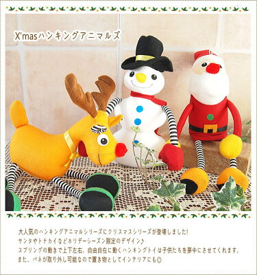 うさぎのリースはこちら ・Spec 商品名 X'masハンキングマスコット 素材 ポリエステル100% サイズ スノーマン全長:約63cm マスコット:約h25.5cm×w33×d6cm サンタ全長:約75cm マスコット:約h34.5cm×w33cm×d6cm トナカイ全長:約65cm マスコット:約h36.5×w21cm×d6cm バネ:約38.5cm〜(伸縮性あり) 備考 重量約80g 対象年齢7歳以上 バネで指などを挟まないようお気をつけください。